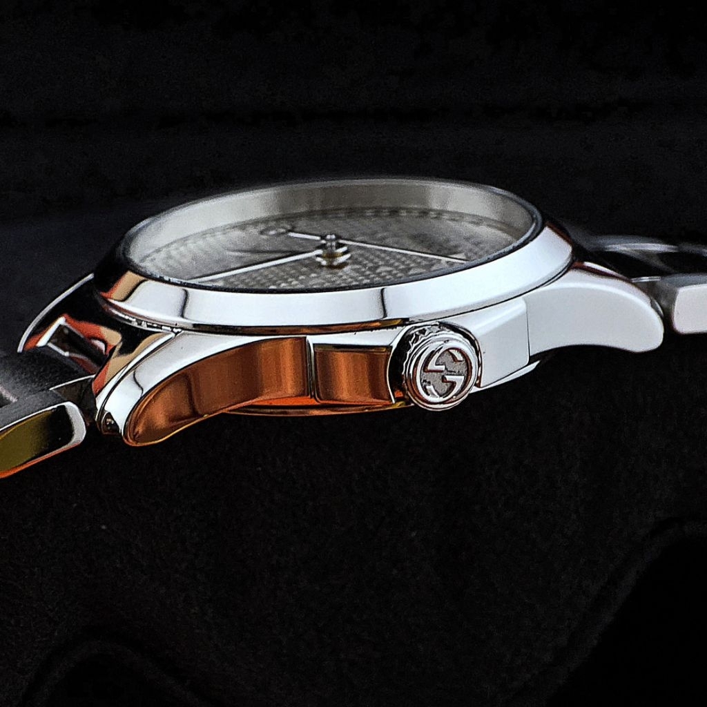 – ขนาดหน้าปัด 27 หนา 8 มิลลิเมตร ระบบ Quartz ใช้งานง่าย ดีไซน์หน้าปัดเอกลักษณ์ Gucci หน้าปัดลาย Geometric / Pyramid pattern เล่นแสงสวยมาก ดูหรูและแตกต่างจากนาฬิกาทั่วไป โลโก้ GUCCI แบบแผ่นโลหะติดบนหน้าปัด (ไม่ใช่พิมพ์) ให้ฟีลพรีเมียม เข็มทรงเรียวหรู พร้อมโลโก้ GG ที่ปลายเข็มวินาที เป็นซิกเนเจอร์ของแบรนด์ สายเดิมของรุ่นขนาด 16.5 เซนติเมตร สภาพสวยกล่องใบครบ ออกใหม่ 40,000++