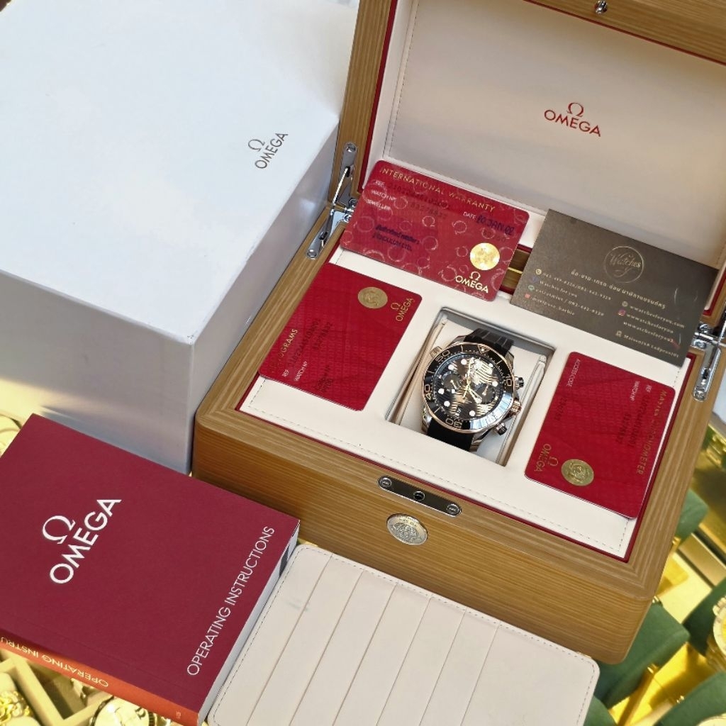 Omega Seamaster Diver 300M Chronograph Ref. 210.22.44.51.01.001 – ขนาดหน้าปัด 44 มิลลิเมตร ตัวเรือน สเตนเลส + 18K Sedna Gold ขอบตัวเรือน Ceramic ผสม18k Sedna Gold ระบบออโตเมติกจับเวลา พรายน้ำสว่าง กันน้ำลึก 300 เมตร สายยางเดิมของรุ่น สภาพสวยกล่องใบครบ ออกใหม่ 447,000 ประหยัดไปเยอะ ตอนนี้ไม่มีจำหน่ายแล้ว นาฬิกาปี 2022 ประกันศูนย์ยังเหลือ คุ้มมากๆ